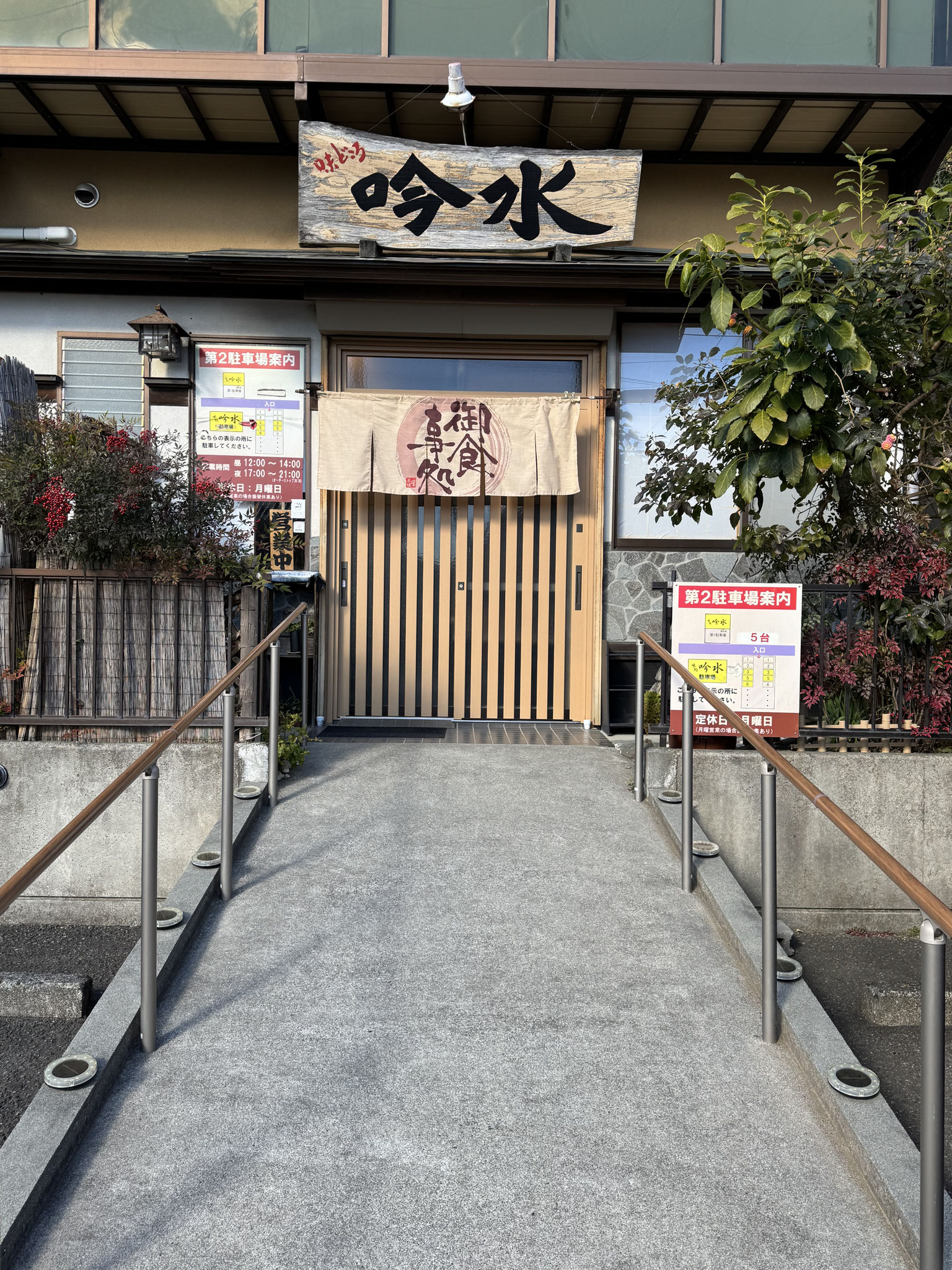 店外からスロープになっております。足のご不自由な方、車椅子の方でも安心してご来店いただけます。靴を脱ぐのがご面倒な方など、、12名様まででしたらご法事の後の御会食や夜のご宴会、ランチの女子会にもご利用頂いております。簾を下げれば個室感覚でご利用いただけます。